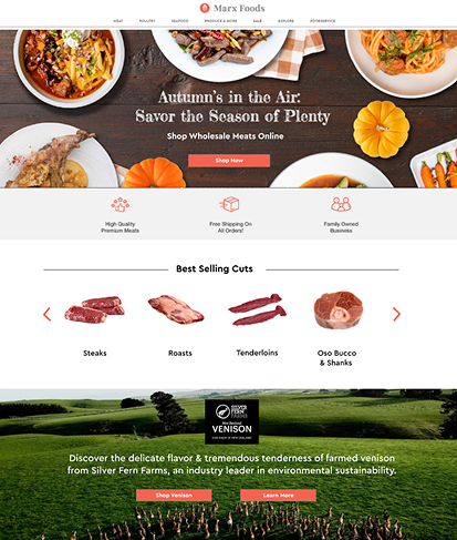 The goal of the Marx Foods redesign was to realign the brand’s visual identity and digital experience with the broader Marx Companies ecosystem while preserving its established market presence. This project focused on bringing Marx Foods’ design language closer to its sister companies to create a more cohesive, recognizable family of brands, while strategically leveraging the strong SEO authority of marxfoods.com to guide qualified users toward the wholesale platform at marxfoodservice.com—improving discoverability, clarity of offerings, and conversion for foodservice customers.
